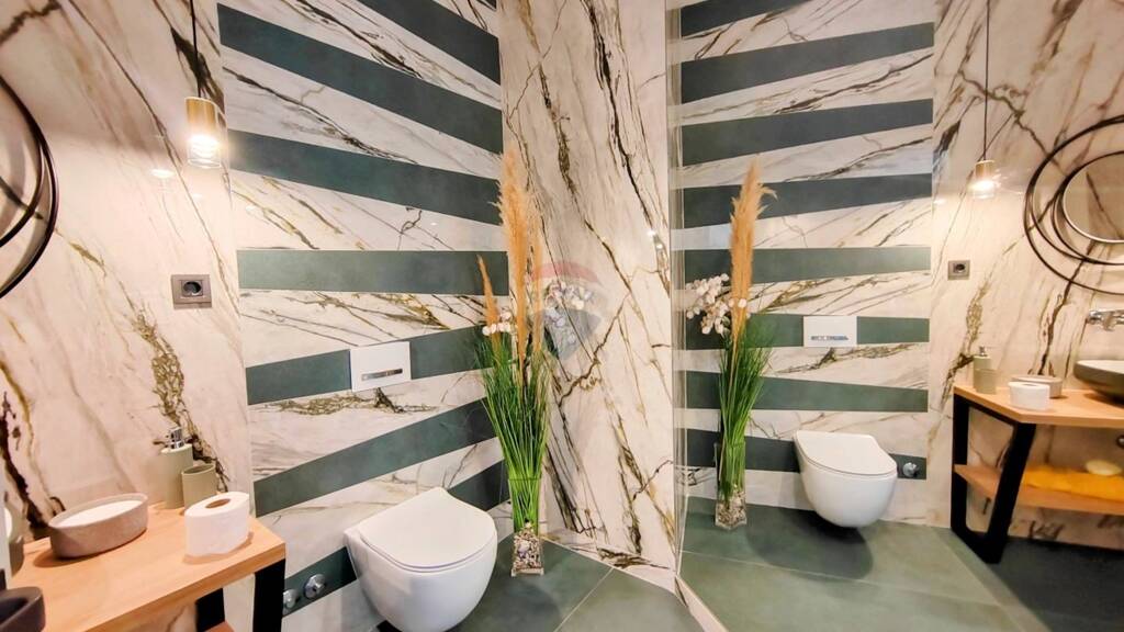 Im Obergeschoss sind drei große Schlafzimmer, jedes mit eigenem Bad und einen atemberaubenden Ausblick auf das Meer und Vrbnik - vom Bett aus. Ein Wellnessraum mit Sauna und Dusche und einem Balkon befinden sich ebenso auf dieser Etage.