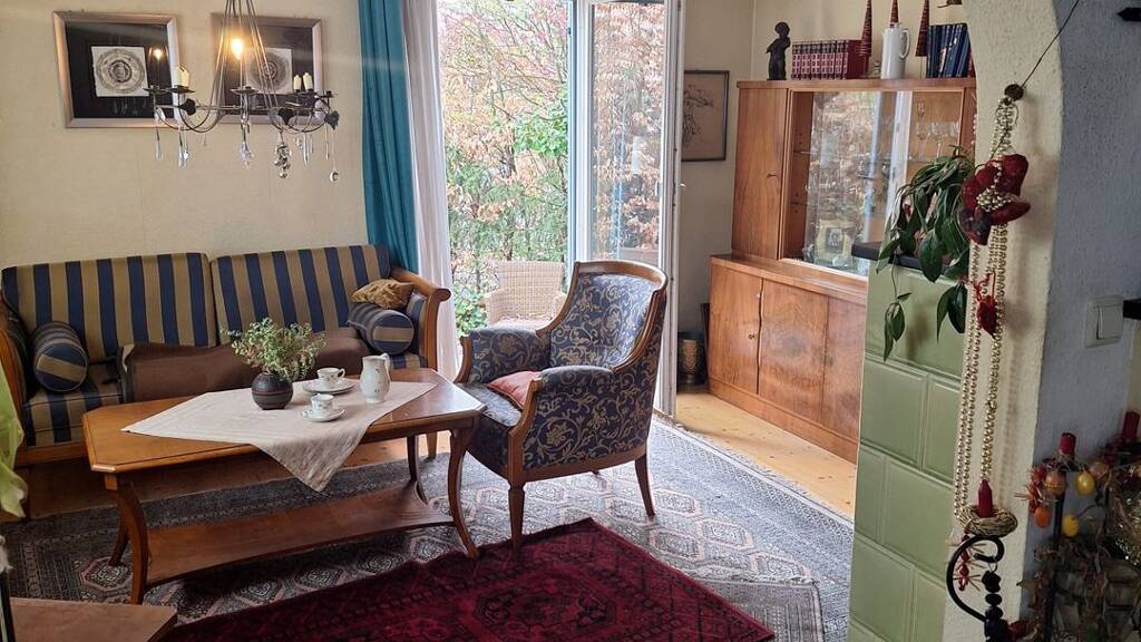 Die Terrassentür im Wohnzimmer, gibt den Blick -nach Westen - auf die geschützt gelegene Sonnenterrasse und den vielfältig bepflanzten, wunderschönen Natur-Garten frei. Die Terrasse bietet ausreichend Platz für eine komfortable Sitzgarnitur, den Grill und lädt zum gemütlichen Verweilen ein.