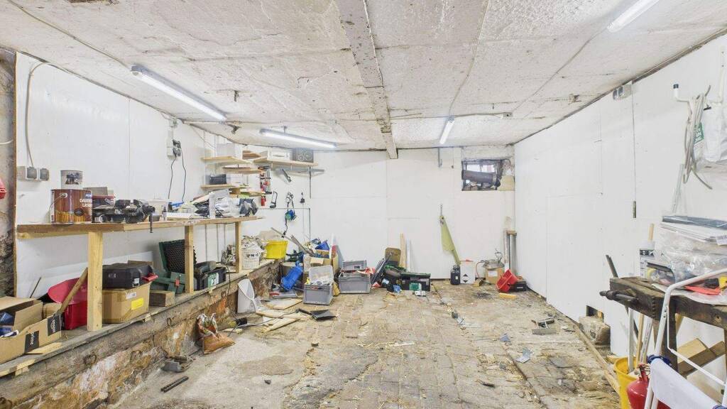 Im Erdgeschoss befindet sich eine Küche mit Essbereich, die durch einen ehemaligen Kaminbereich ergänzt wird und dem Raum eine besonders gemütliche Struktur verleiht. Zusätzlich steht ein Gäste-WC mit Duschbereich zur Verfügung.