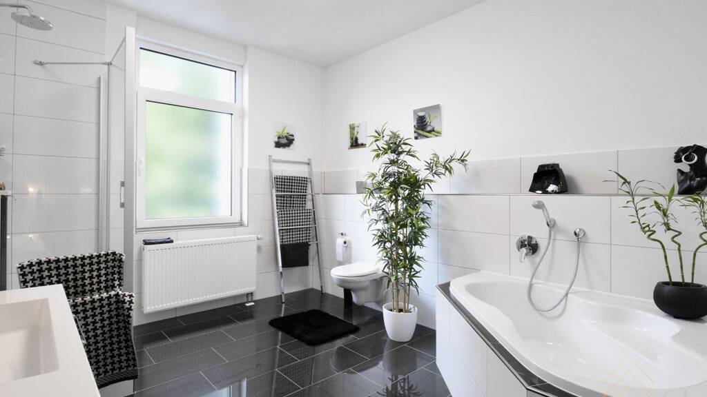 Das Badezimmer überzeugt durch seine hochwertige Ausstattung, edle Fliesen sowie eine elegante Eckbadewanne und eine komfortable Dusche. Ein separates Gäste-WC sorgt für zusätzlichen Komfort. Ein praktischer Vorratsraum ergänzt den durchdachten Grundriss perfekt.