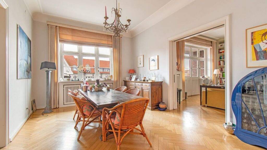 - Historisches Wohngebäude aus dem Jahr 1921 in begehrter, alsternaher Lage von Rotherbaum - Repräsentative Altbauarchitektur mit denkmalgeschützter Fassade und hanseatischem Charakter - Personenaufzug für komfortable Erreichbarkeit der Wohnung - Großzügige 7-Zimmer-Eigentumswohnung im 5. Obergeschoss mit ca. 248 m² Wohnfläche - Weitläufige Diele mit beeindruckendem Raumgefühl - Repräsentativer Wohnbereich bestehend aus einem Esszimmer, Wohnzimmer und Kaminzimmer mit Zugang zu einem Süd-West Balkon - Hochwertige Bulthaup-Küche mit Kochinsel, integrierter Essmöglichkeit und französischem Balkon - Fischgrätparkett und klassische Dielenböden unterstreichen den Altbaucharakter - Insgesamt vier Schlafzimmer, davon zwei mit begehbaren Ankleidezimmern - Zwei Badezimmer sowie ein separates Gäste-WC - Balkon mit Südwest Ausrichtung sowie zwei weitere mit Ost-Ausrichtung - Der Wohnung sind ein Kellerabteil und ein Dachbodenabteil zugeordnet - Die Beheizung erfolgt über eine Zentralheizung mit Fernwärme - Stellplätze können in einer naheliegenden Tiefgarage angemietet werden