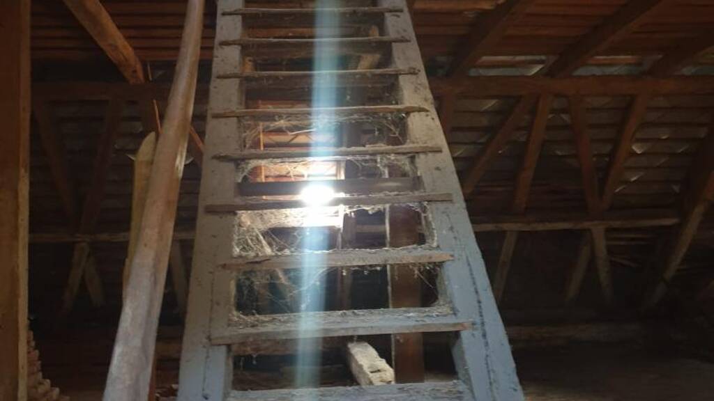 Die zwei derzeit nicht ausgebauten DachgeschoĂź Ebenen erreicht man ĂĽber eine ebenso hundert Jahre alte Holzstiege.
