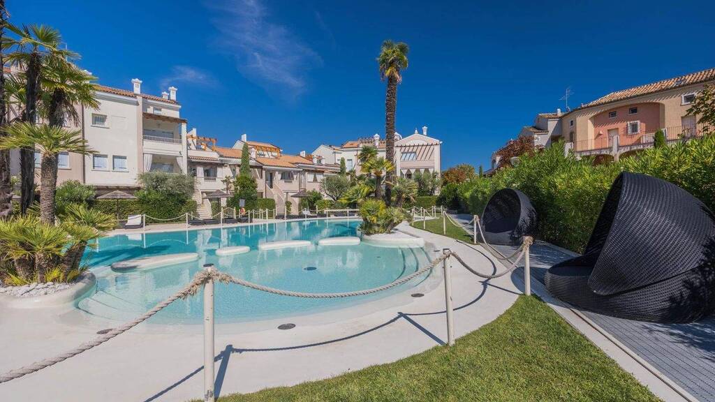 Der Wohnkomplex selbst wurde 2008 erbaut und besticht durch eine moderne, gut durchdachte Architektur. Besonders erwähnenswert ist der spektakuläre Poolbereich, der sowohl funktional als auch optisch beeindruckt. Der großzügige Pool ist modern gestaltet und von einer gepflegten Liegewiese umgeben. Wer lieber ein mediterranes Strandgefühl genießen möchte, findet am künstlich angelegten Sandbereich den perfekten Ort zum Entspannen. Ob Sonnenbaden, Schwimmen oder einfach nur Abschalten – hier fühlt sich jeder Urlaubsmoment wie selbstverständlich an.