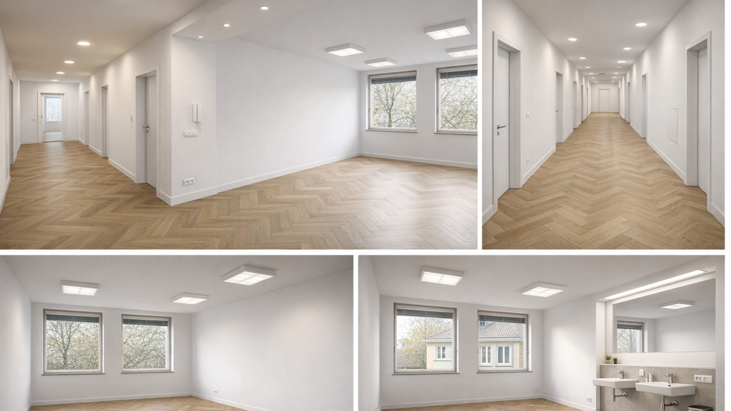 Die Fläche wird umfassend und hochwertig renoviert. Der Ausbau erfolgt in enger Abstimmung mit dem zukünftigen Mieter, sodass individuelle Gestaltungs- und Ausstattungswünsche berücksichtigt werden können. Geplant ist eine helle, moderne Bürofläche mit neuem Bodenbelag in hochwertiger Optik, neu gestalteten Wand- und Deckenflächen, moderner LED-Beleuchtung, neuen Türen, zeitgemäßer Elektroinstallation sowie neuen, dreifach verglasten Fenstern mit elektrischen Außenjalousien. Auch die WC-Einheiten werden vollständig erneuert und zeitgemäß ausgestattet.