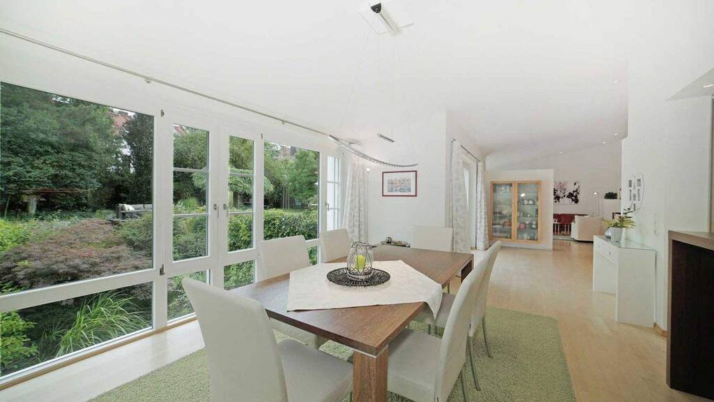 Die helle Küche aus dem Jahr 2010, mit allem Komfort und hochwertigen Geräten von Gaggenau ausgestattet, fließt harmonisch in den großzügigen Essbereich über. Der Wohnbereich erfüllt alle Größenansprüche, bleibt geschickt aufgeteilt und mit Kaminofen dennoch heimelig und gemütlich. Ein großes Arbeitszimmer mit Einbauschränken komplettiert das rd. 142 m² große Erdgeschoss.
