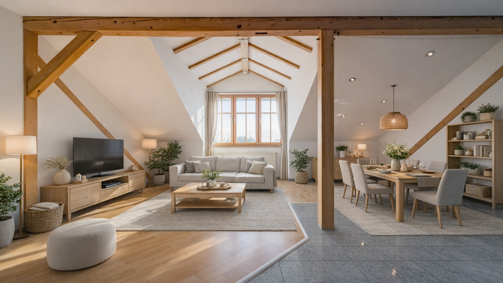 Das Dachgeschoss wurde 2003 genehmigt und ausgebaut und wirkt wie ein eigenes Zuhause im Zuhause. Offenes Wohnen, Sichtbalken, warme Materialien und ein Balkon mit großen Hebeschiebetüren schaffen eine Atmosphäre, die sofort ankommt. Ob für erwachsene Kinder, als eigener Bereich für Eltern oder als großzügiger Hauptwohnbereich - hier lässt sich Wohnen neu denken. Der mögliche Kaminanschluss unterstreicht das gemütliche, wohnliche Gefühl.