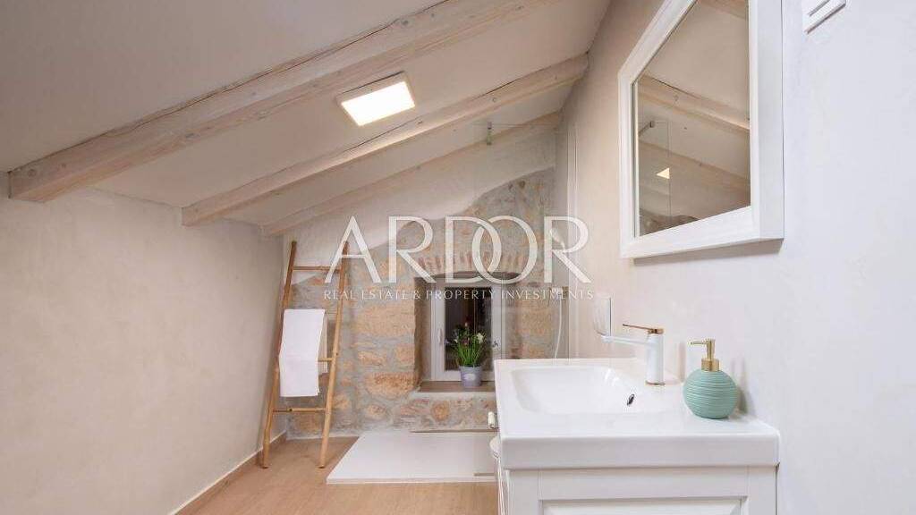 In Bribir, umgeben von Meer und Bergen, befindet sich ein renoviertes Steinhaus, das sowohl im Innen- als auch im Außenbereich mit besonderer Sorgfalt gestaltet wurde. Im Erdgeschoss gibt es einen offenen Wohnbereich, eine voll ausgestattete Küche mit Essbereich, ein Schlafzimmer mit eigenem Bad und Terrasse sowie ein zusätzliches separates WC. Im Obergeschoss befindet sich das Master-Schlafzimmer mit eigenem Badezimmer.