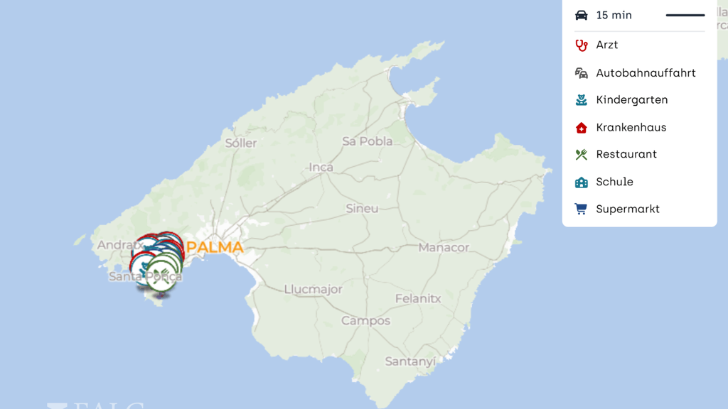 Mit dem Auto sind mehrere Autobahnauffahrten in der Nähe, jeweils in etwa 5 km Entfernung. Dadurch gelingen Fahrten in Richtung Palma Zentrum, zu den Stränden an der Südküste sowie in andere Teile der Insel unkompliziert. Auch der Flughafen Palma de Mallorca ist mit dem Auto in kurzer Zeit erreichbar, was die Lage sowohl für Berufspendler als auch für regelmäßige Reisende attraktiv macht.