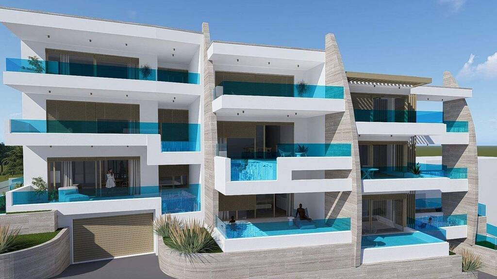 Die Wohnung besteht aus einem geräumigen Wohnzimmer mit offener Küche und Essbereich, der auf eine Terrasse mit privatem Pool führt. Es gibt zwei Schlafzimmer, eines davon mit Zugang zu einem eigenen Balkon, während das andere eine Glaswand mit spektakulärem Meerblick besitzt. Die Wohnung verfügt außerdem über ein Badezimmer und ein zusätzliches WC.