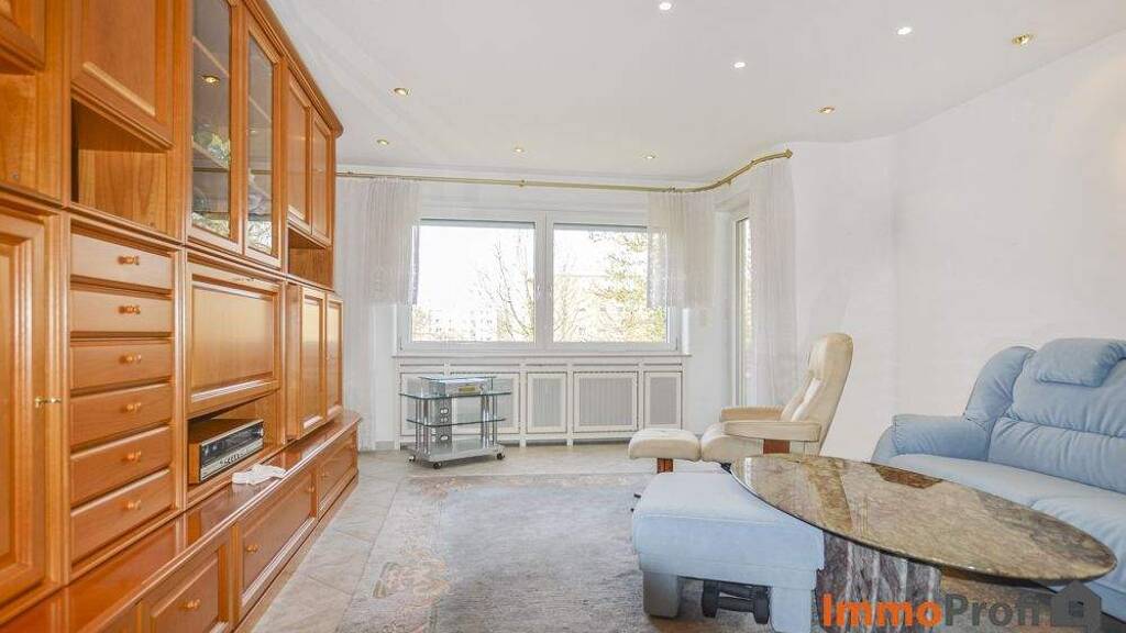Das großzügige Wohnzimmer bildet den Mittelpunkt der Wohnung und verfügt über einen direkten Zugang zur Loggia, die zum Entspannen im Freien einlädt. Der Wohnbereich ist mit Fliesen ausgestattet und bietet durch die großen Fensterflächen eine angenehme Helligkeit.