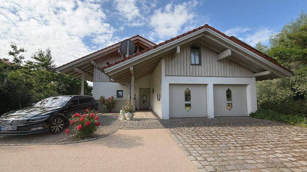 Die Doppelgarage mit direktem Hauszugang sowie fünf zusätzliche Stellplätze bieten bequem Platz für Familie und Gäste.