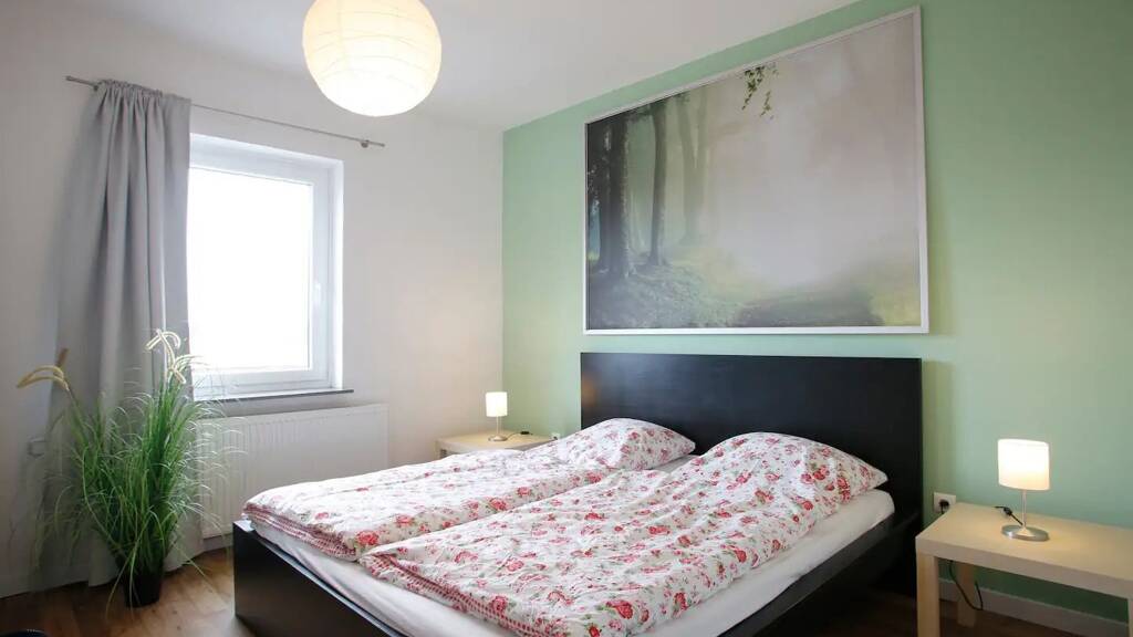 Die ruhige 72 qm-Wohnung hat 2 Schlafzimmer mit Doppelbett, ein Wohnzimmer mit Schlafsofa, Wohnküche mit Esstisch Sitzplätzen für 4 Personen und ein großzügiges Bad mit Dusche und WC.