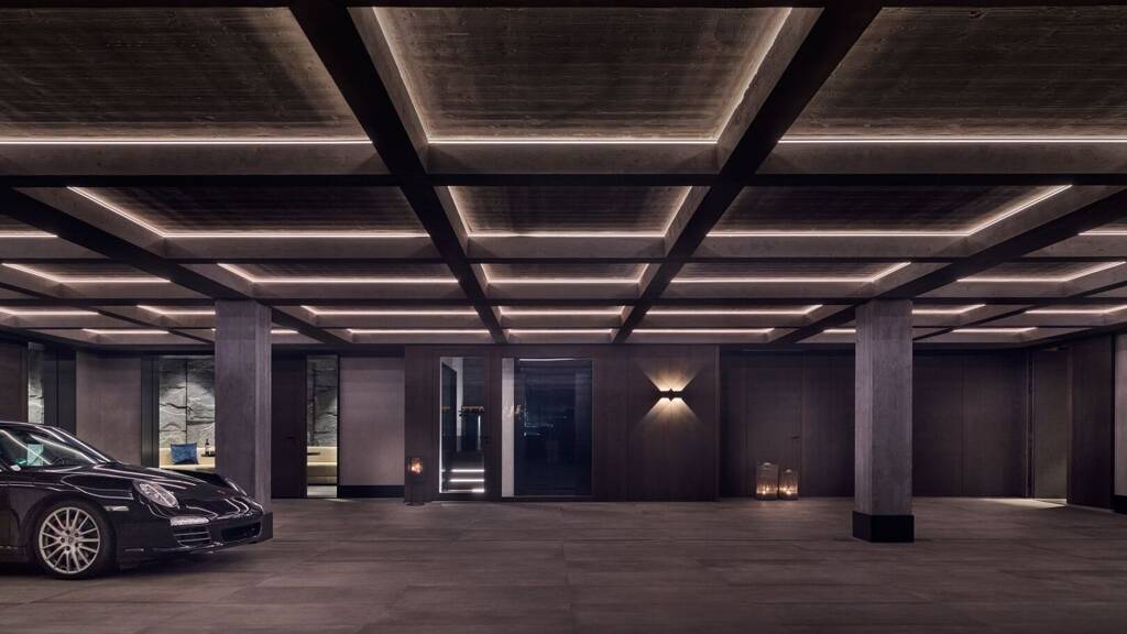 Die Zufahrtsebene empfängt mit einer speziell designten, beheizten Garage mit sechs übergroßen Stellplätzen (weitere 3 PKW-Stellplätze im Freien), flankiert von einem eigenständigen Apartment, der Weinlounge, Sportgarderobe und Haustechnikräumen. Symmetrisch gegenüber dem Garagentor gelegen verbinden das Treppenhaus sowie der transparente Aufzug alle Ebenen.