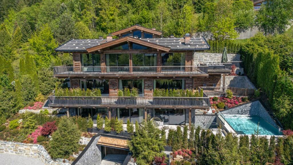 Eingebettet in die Wiesen rund um den Schwarzsee fügt sich Chalet S diskret in die exklusive Nachbarschaft zwischen der Stadt Kitzbühel und dem romantischen Seengebiet ein. Von außen wirkt das Chalet wie eine zeitgenössische Interpretation des klassischen Tiroler Chalets - das sonnenverbrannte Altholz der Obergeschossfassaden harmoniert mit den großformatigen Natursteinfassaden auf der Pool- und Garagenebene. Das fein verästelte Design des Balkongeländers erinnert an die Kronen der umliegenden Bäume. Die Symmetrie des Gebäudes aus Ost- und Westrichtung spiegelt die geradlinigen Grundrisse des Anwesens wider.