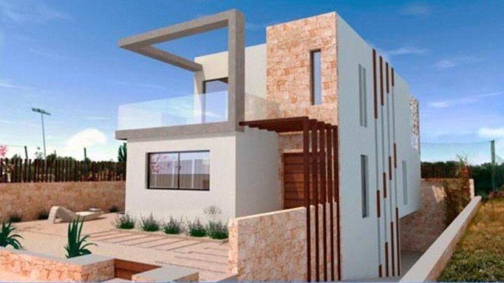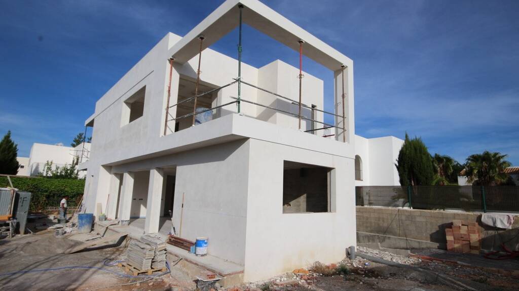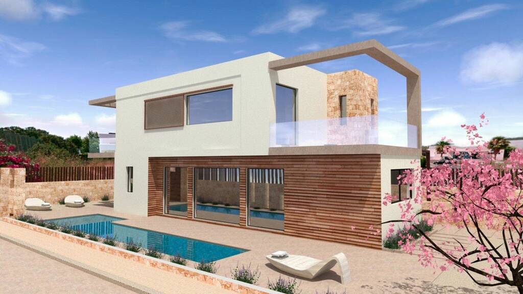 Diese neu erbaute Archttekturvilla verbindet modernste Ansprüche mit mediterranem Lebensgefühl. Auf zwei Etagen ist Luxus und Wohlfühlen lebbar. Großzüge Glasfronten lassen Licht und Luft in das modern gestaltete Innere. Balkone und Terrassen laden zum Leben Drinnen wie Draußen ein. Hochwertige Materialien sind verarbeitet, und clevere Architekturideen spielen mit traditionellen Mustern in neuen Formen, wie die angedeute Pergola, die zugleich einem großen Fenster gleicht und geschickt Schatten spendet.