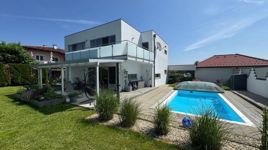 Dieses moderne Einfamilienhaus in Massivbauweise vereint zeitlose Architektur mit effizienter Energietechnik – auf einem sonnigen Eckgrundstück in ruhiger Lage. Mit Photovoltaik, Erdwärme und hochwertiger Ausstattung bietet die Immobilie sowohl stilvollen Wohnkomfort als auch bemerkenswerte Betriebskostenersparnis. Der uneinsehbare Garten ist liebevoll gestaltet und garantiert herrliche Privatsphäre. Highlight ist der moderne Pool mit verschiebbarer Überdachung – ideal zum Schwimmen bei jedem Wetter. Die großzügige Terrasse mit Glasüberdachung lädt zum Verweilen und Genießen ein.