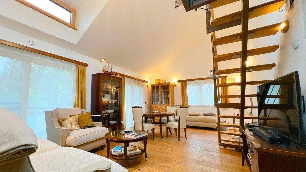 Die ausgewöhnliche Wohnung im 1.Obergeschoss mit 2 Zimmern mit stylischer Galerieebene und ca. 92m² Wfl. besitzt ebenfalls einen ca. 38m² großer Wohn-/Essbereich mit direktem Anschluss an einen Balkon, mit süd-/ westlicher Ausrichtung, dem Aufgang zur Galerie und einem angegliederten Küchenbereich, der mit einer modernen EBK ausgestattet ist. Des Weiteren verfügt die Wohnung über ein Schlafzimmer und ein Bad mit Dusche. Sowohl der Wohn-/Essbereich, als auch das Schlafzimmer sind an einer Klimaanlage angeschlossen.