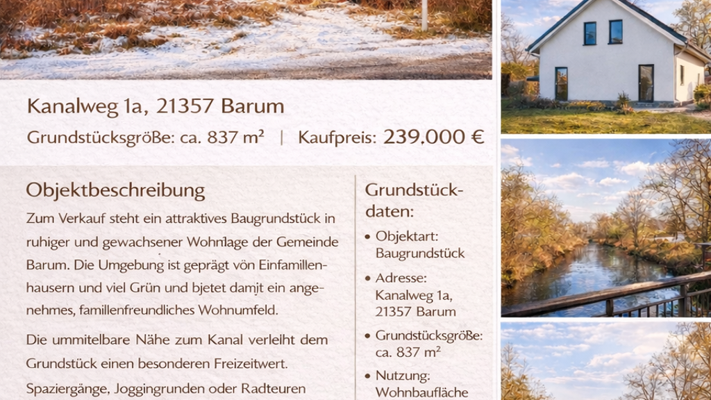Entdecken Sie ein attraktives Baugrundstück in einer ruhigen und familienfreundlichen Umgebung, das sich ideal für den Bau eines Bungalows oder eines Einfamilienhauses eignet. Die direkte Nähe zum Kanal bietet nicht nur eine wunderschöne Aussicht, sondern auch zahlreiche Möglichkeiten zur Freizeitgestaltung. Ein Bodengutachten liegt ebenfalls vor, was den Bauprozess erheblich erleichtert. Nutzen Sie diese Gelegenheit, um sich Ihren Traum vom eigenen Zuhause zu verwirklichen!