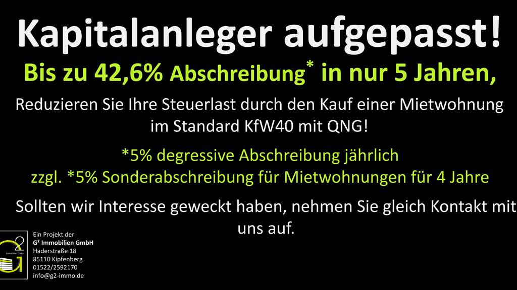 Auf einem ruhigen und herrlich gelegenen Grundstück in der Mitte der prosperierenden Gemeinde Denkendorf, entsteht der von der G² Immobilien GmbH geplante Wohnpark Wassertal II. Auf dem 3.200 m² großen Grundstück entsteht eine anspruchsvolle und qualitative Wohnanlage mit 24 Wohnungen in zwei Gebäuden, die sich dem Charakter des Ortsbildes entsprechend, harmonisch in die umliegende Bebauung einfügt. Die Fertigstellung der des Projekts ist bis Februar 2026 geplant.