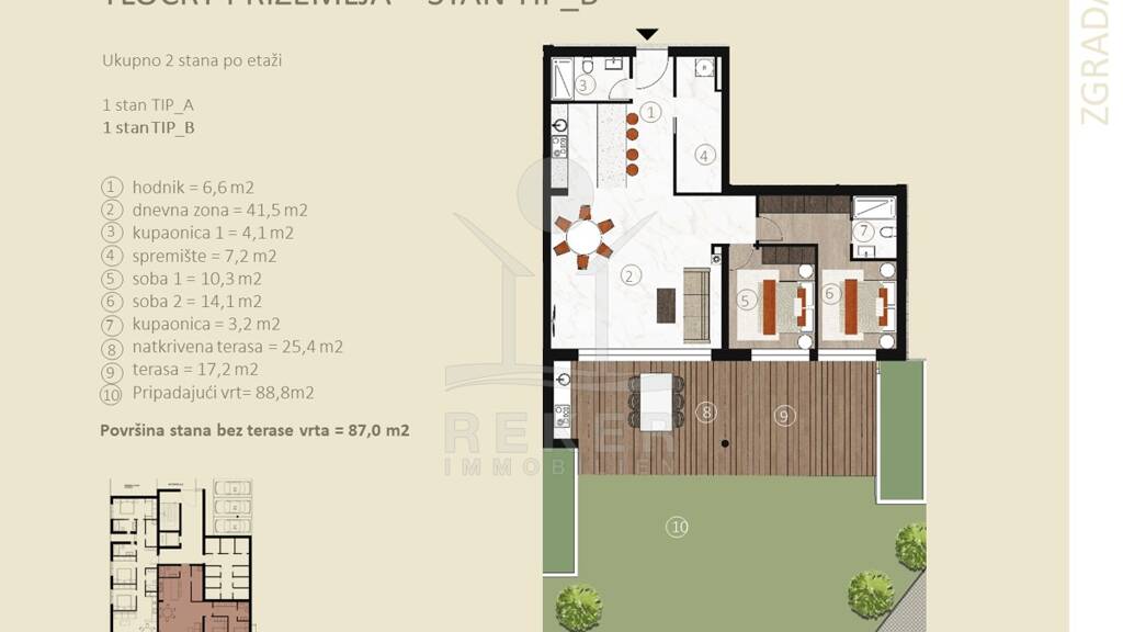 Stellplatz vorhanden, Anzahl der Schlafzimmer: 2, Anzahl der Badezimmer: 2, Anzahl Terrassen: 1, Balkon-Terrassen-Fläche: 42,00 m², Gartenfläche: 113,00 m², 1 Etagen, Distanz vom Zentrum: 2.00