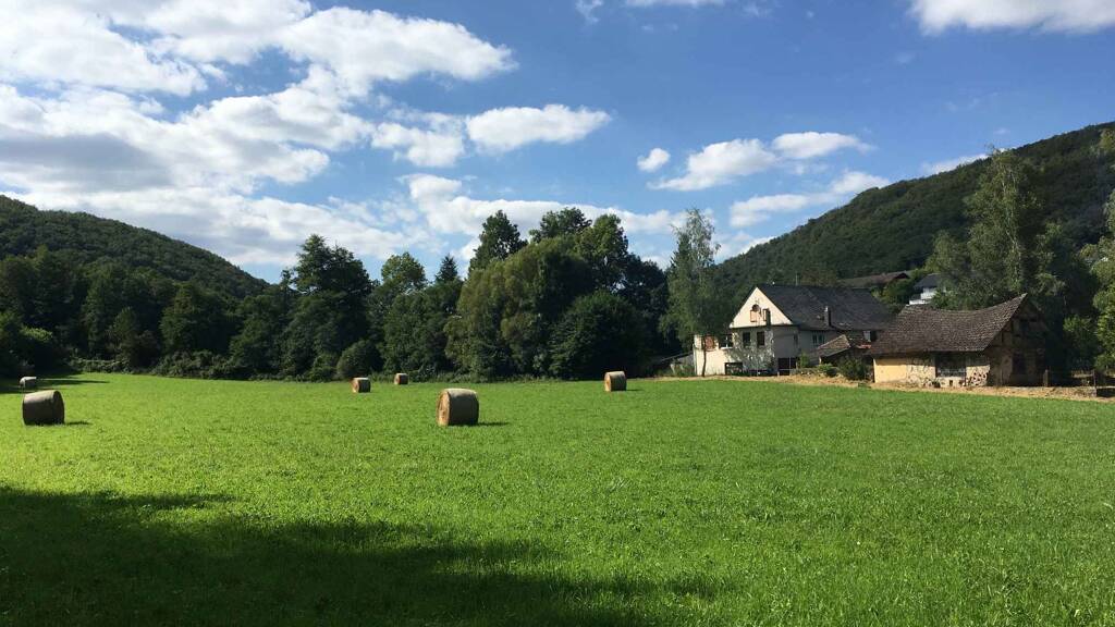 Der Bach ‚Hahnenbach‘ durchzieht die im Eigentum befindlichen Wiesenflächen und wird von Wäldern und Baumgruppen umgeben.