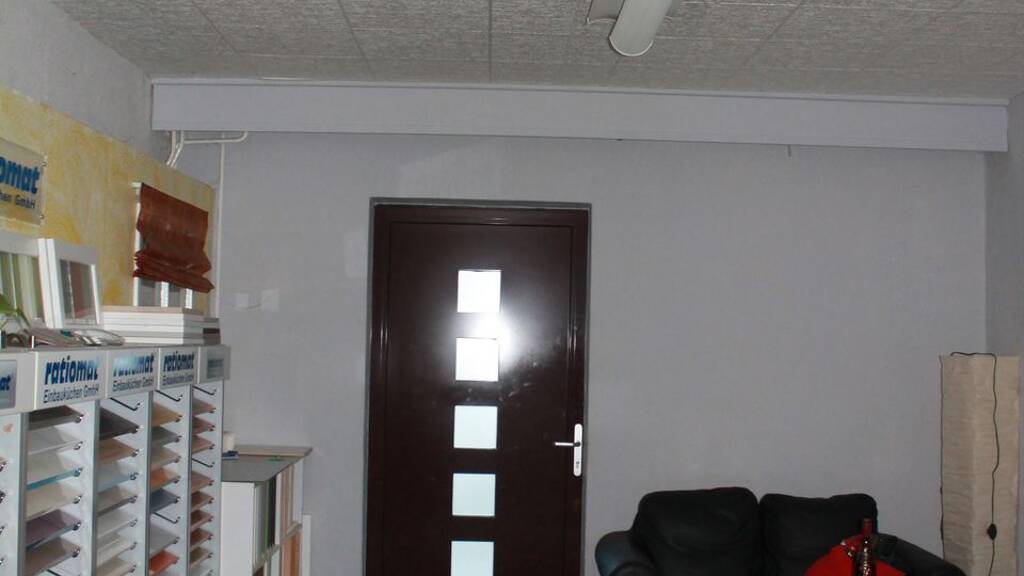 Empfangstresen, Linolium, Bad mit Dusche, Damen Herren WC Großraumbüro oder Aufenthalt mit Einbauküche, kleinere separate Büros
