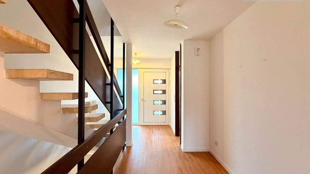 Betritt man den großzügigen Eingangsbereich gelangt man in das großzügige Wohn- und Esszimmer. Von hier aus hat man einen Blick und Zugang zum Balkon. Des weiteren befindet sich auf der Etage die Küche und ein Gäste-WC. Im Obergeschoss findet man 3 Schlafzimmer sowie ein Bad mit Dusche und Badewanne.