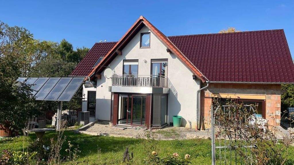 Beheizt wird das Haus mit einer Luft- Wärme- Pumpe und Erdwärme. Der Rohbau seitlich des Gebäudes ist leider nicht fertig geworden, besitzt jedoch viel Potenzial und Ideen zur Nutzung. Ideal ist dieses Schmuckstück für eine junge Familie, die auf eine hochmoderne Küche, viel Technik und jede Menge Platz für die Kids nicht verzichten möchte.