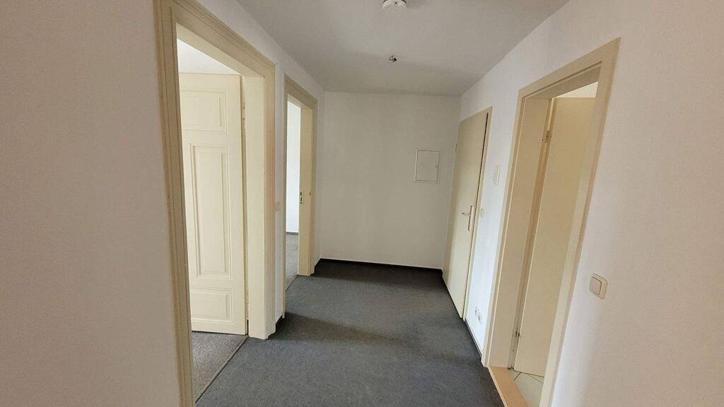 Große 3 Raumwohnung mit Wohnküche. Helle und gut geschnittene Räume. Im Wohnzimmer aufgearbeitete Echtholzdielen. Schlaf- und Arbeits-/Kinderzimmer mit Teppich. Alle Räume sind vom Flur zugänglich. Das Bad verfügt über eine Wanne, eine Waschbecken, ein WC, einen Waschmaschinenanschluss und ein Fenster. Der Wäschetrockenraum auf dem Boden kann gemeinschaftlich genutzt werden. Des Weiteren stehen ein Kellerraum und ein Abstellraum (halbe Treppe tiefer) zur Verfügung.