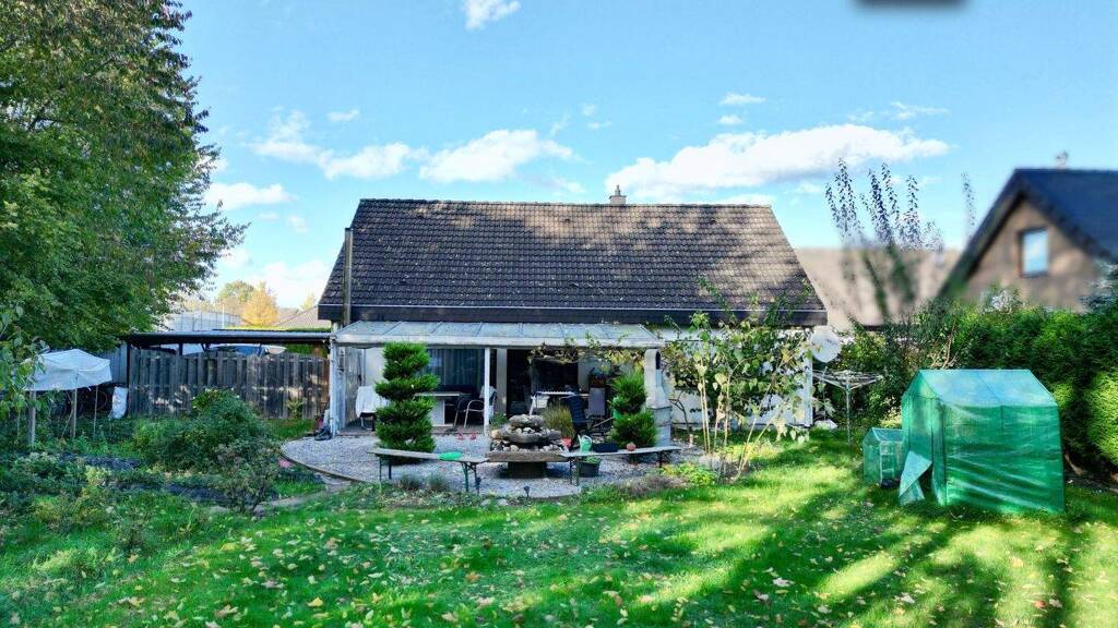 Das Herzstück des Hauses bildet der offene Wohnbereich mit Küche. Eine Trennwand wurde 2018 entfernt, wodurch ein lichtdurchfluteter Raum mit Kamin entstand - ideal für gemütliche Stunden. Vom Wohnzimmer aus gelangen Sie direkt auf die Terrasse und in den weitläufigen Garten.