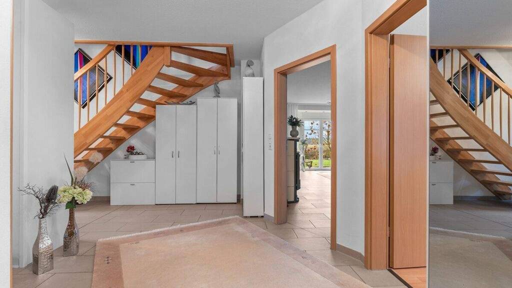 Bereits beim Betreten empfängt Sie eine großzügige Diele, von der aus sämtliche Räume des Erdgeschosses bequem erreichbar sind. Eine breite Vollholztreppe führt von hier aus in das Dachgeschoss und unterstreicht den wertigen Charakter des Hauses.