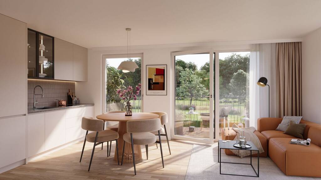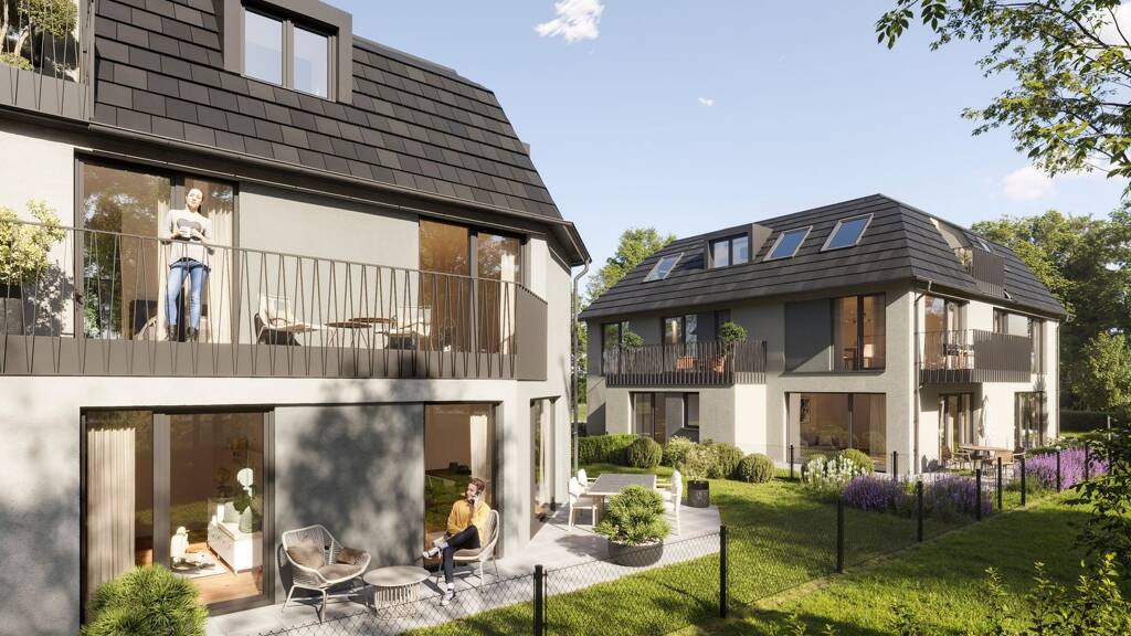Diese besondere 2-Zimmer-Wohnung im Dachgeschoss von Haus 4 besticht durch ihre Helligkeit, ihren Charme und die großzügige Süd-Dachterrasse. Der offene Wohn- und Essbereich mit integrierter Küche ist lichtdurchflutet durch mehrere Dachflächenfenster und bietet direkten Zugang zur sonnigen Terrasse – ideal für entspannte Stunden mit Weitblick. Das Schlafzimmer ist ebenfalls zur Südseite ausgerichtet und überzeugt durch angenehme Helligkeit. Die Diele empfängt mit zusätzlichem Tageslicht über ein Dachfenster. Das Badezimmer liegt zur Ostseite und ist mit einem Fenster ausgestattet. Es verfügt über eine bodengleiche Dusche, WC und einen praktischen Waschmaschinenanschluss. Ein Kellerabteil sowie ein optionaler Stellplatz in der Tiefgarage stehen wie bei allen Wohnungen im Ensemble ebenfalls zur Verfügung.