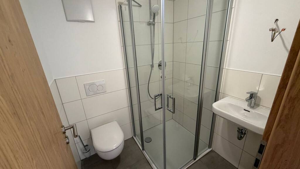 Das moderne Tageslichtbad ist mit einer bodengleichen Dusche, Waschbecken, WC sowie einem Handtuchheizkörper ausgestattet. Zeitlose Fliesen und eine klare Gestaltung sorgen für ein elegantes und pflegeleichtes Ambiente.