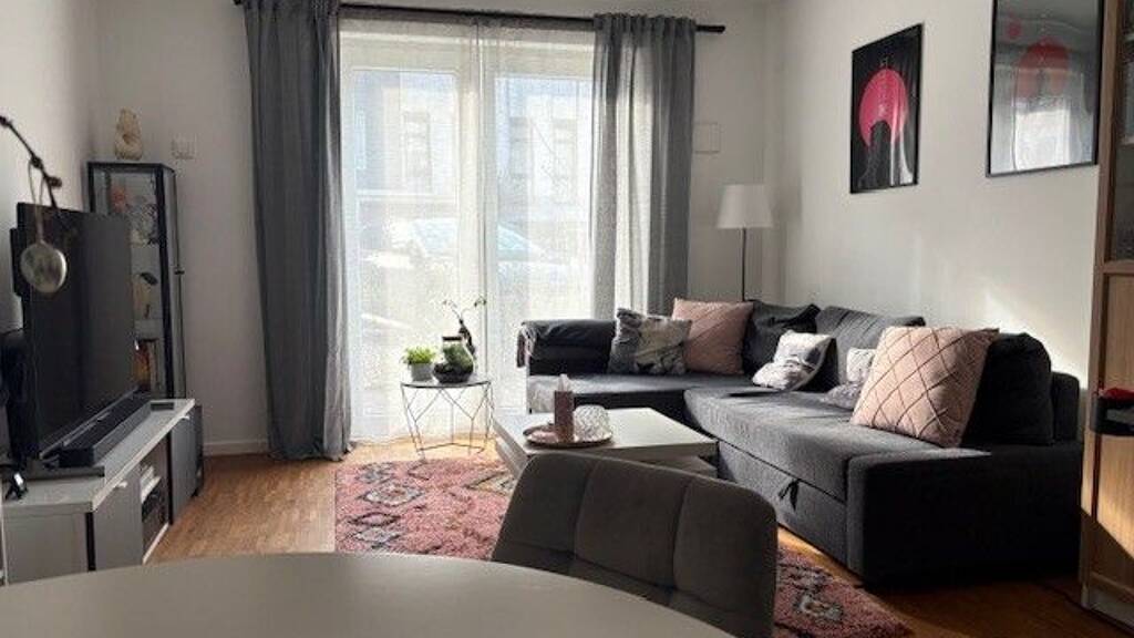 Die Wohnung umfasst einen geräumigen Schlafraum und ein helles Wohnzimmer, das Zugang zu einer kleinen Terrasse bietet. Von der Küche aus gelangen Sie ebenfalls auf die Terrasse, die einen Blick ins Grüne und Zugang zu einem kleinen Gartenstück bietet.