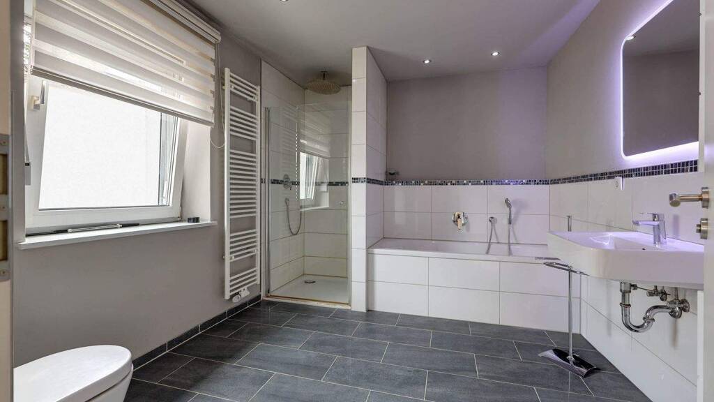 Das Badezimmer im ersten Stock wurde ebenfalls hochwertig renoviert und bietet sowohl eine Badewanne als auch eine separate Dusche, was für zusätzlichen Komfort sorgt. Die Kombination aus modernen Fliesen, eleganten Armaturen und viel Licht verleiht dem Raum eine wellnessartige Atmosphäre.