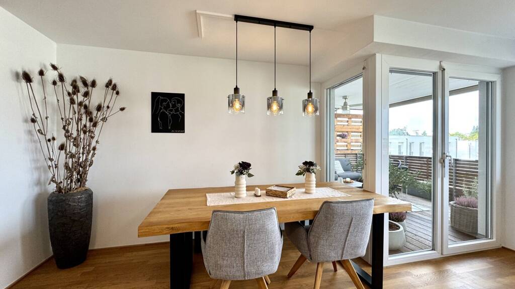 Ein großzügiger Eingangsbereich heißt Sie beim Betreten der Wohnung willkommen. Von hier aus gelangen Sie direkt in den lichtdurchfluteten, offenen Wohn- und Essbereich, der dank der großen Glasfronten eine angenehme und einladende Atmosphäre schafft. Die voll ausgestattete Küche lässt keine Wünsche offen und bietet Ihnen alle Annehmlichkeiten für kulinarische Genüsse.