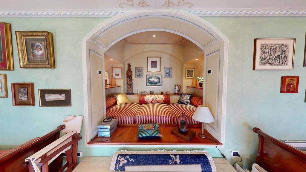 Die in Pastelltönen gehaltene, mit Fresken verzierte Decke und die Dekorationen im venezianischen Stil machen dieses Studio-Apartment am Lago Maggiore einzigartig.