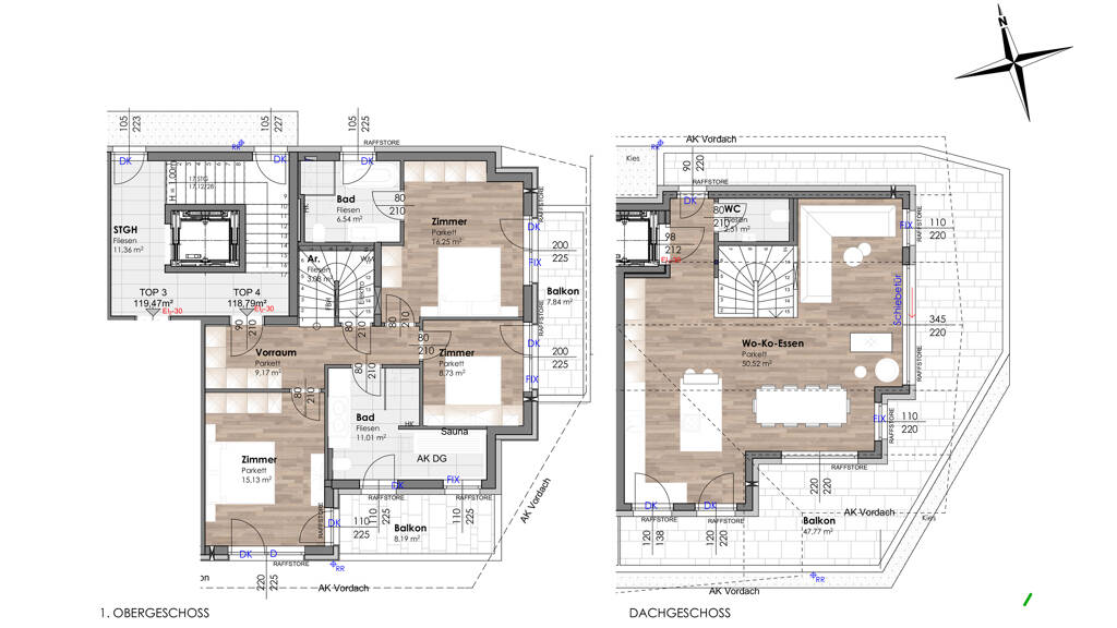 Hierbei handelt es sich um die ca. 119 m² große Penthouse-Maisonette-Wohnung Top 4 welche sich über das 1. Obergeschoss bis in das Dachgeschoss erstreckt. Im 1. OG befindet sich der Haupteingang der Wohnung, mit dem Lift oder über eine in der Wohnung befindliche Treppe gelangt man in das Dachgeschoss. Die Diele/Garderobe, zwei Kinder/Gästeschlafzimmer mit Badezimmer sowie der Masterbedroom mit Bad en Suite und zwei Balkone befinden sich im 1. Obergeschoss.