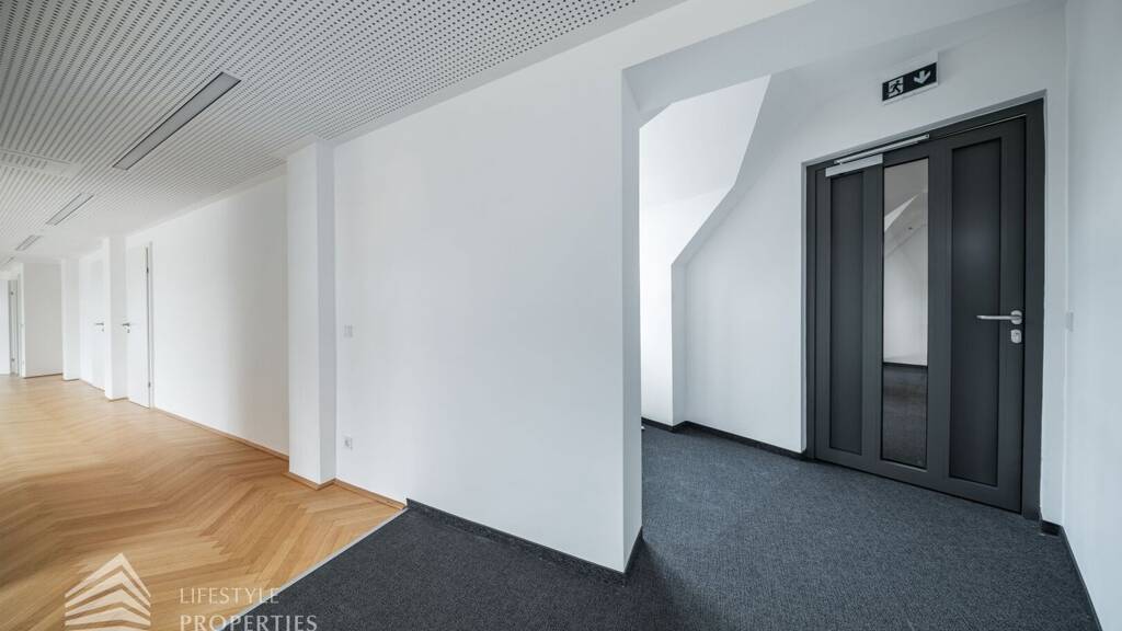 Beim Betreten des Büros steht man direkt im ca. 21 m² großen Vorraum, dieser mit dem angrenzenden Büro geteilt ist. Beim Eingang befindet sich der ca. 15 m² große Empfang. Durch einen ca. 12 m² langen Gang gelangt man zu den einzelnen Büroräumen. Auf der linken Seite des Ganges befindet sich ein Sozialraum mit einer Teeküche sowie auf der rechten Seite die Toiletten für die Damen und Herren und einen Serverraum. Die Fläche des Heizraumes wird auf vier Einheiten aufgeteilt.