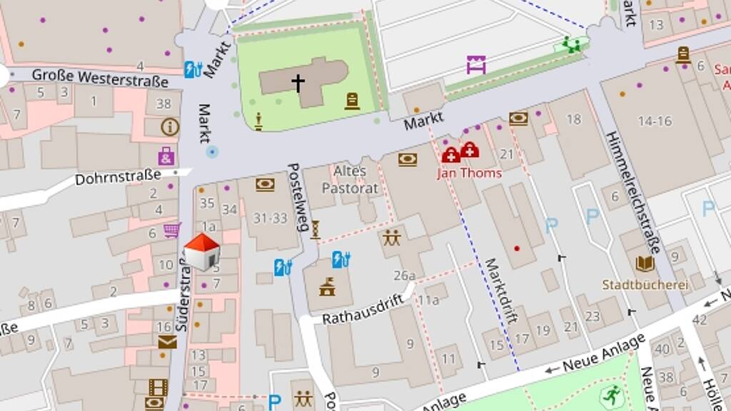 Ein Betreiber-Pkw-Stellplatz ist direkt am Haus befindlich. Für Kunden und Angestellte stehen diverse öffentliche Parkmöglichkeiten wie z.B. der öffentliche Parkplatz hinter der Post, die Parkpalette der Heider Marktpassage sowie auf dem Marktplatz zur Verfügung.