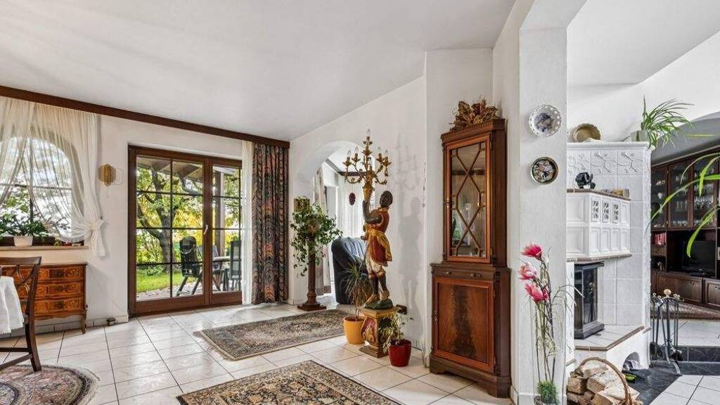 Im Erdgeschoss bildet der offene Wohn- und Essbereich das Herzstück des Hauses. Eine angrenzende Südterrasse erweitert den Wohnraum ins Grüne. Besonders eindrucksvoll ist das Kaminzimmer mit deckenhoher Fensterfront, das für ein helles, offenes Raumgefühl sorgt. Ebenfalls auf dieser Ebene befinden sich die Küche sowie ein Bad mit Dusche und WC.