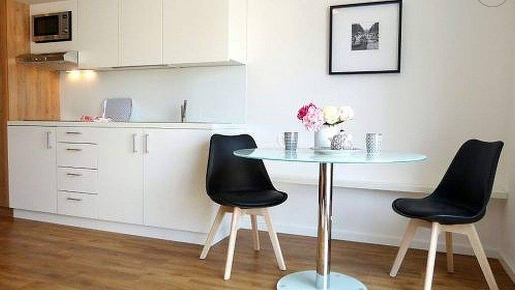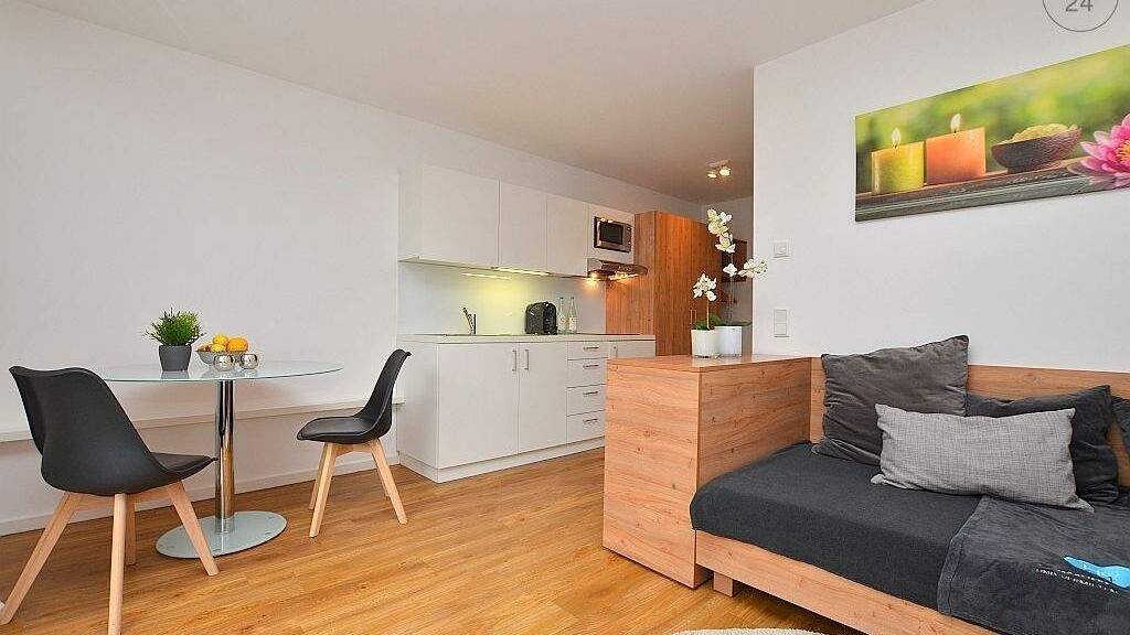 Das exklusive Neubau-Mehrfamilienhaus liegt zentral aber dennoch im Grünen in Euerbach. Die Wohnung befindet sich im Erdgeschoss und ist mit Laminatboden, sowie im Badezimmer mit Fliesenboden verlegt. Im offen gestalteten Wohn- und Essbereich ist eine voll ausgestattete Küchenzeile mit zwei Ceran-Kochfeldern und einer Mikrowelle integriert. Hier ist ein Esstisch mit zwei Stühlen vorhanden. Eine große Fensterfläche zur großzügigen Terrasse hin sorgt für einen hellen Raum. Der Wohnbereich mit modernen Möbeln ist mit einem Kleiderschrank, Einzelbett mit hochwertiger Springbox Matratze, Sessel mit Ablagefläche, welche als Schreibtisch genutzt werden kann, einem TV und einer Kommode eingerichtet. Hier gelangt man auf die sonnige Terrasse mit Sonnenliege, welche zum Entspannen einlädt. Eine hochwertige Ausstattung ist ebenfalls im großzügigen Tageslichtbad mit ebenerdiger Glasdusche, WC, beheizbaren Handtuchhaltern und einer Waschmaschine vorhanden. Wohlige Wärme wird über die Fußbodenheizung erzielt. Das Haus wird mit einer modernen Luft-Wärmepumpe und Sonnenkollektoren auf dem Dach beheizt. In der angegebenen Miete ist eine Betriebskostenpauschale von 150€ enthalten. Wlan (moderne DSL- Leitung mit bis zu 100 Mbit/Sek.) und ein eigener Stellplatz direkt am Haus sind im Mietpreis inkludiert. Bei Auszug wird eine Endreinigung je nach Aufwand mit der Kaution verrechnet. Die Stadtmitte und das Industriegebiet Maintal mit seinen großen Unternehmen ist innerhalb weniger Minuten mit dem Auto, Bus oder über den Fahrradweg zu erreichen. Die Wohnung ist durchgängig ebenerdig, daher auch für Rollstuhlfahrer geeignet.