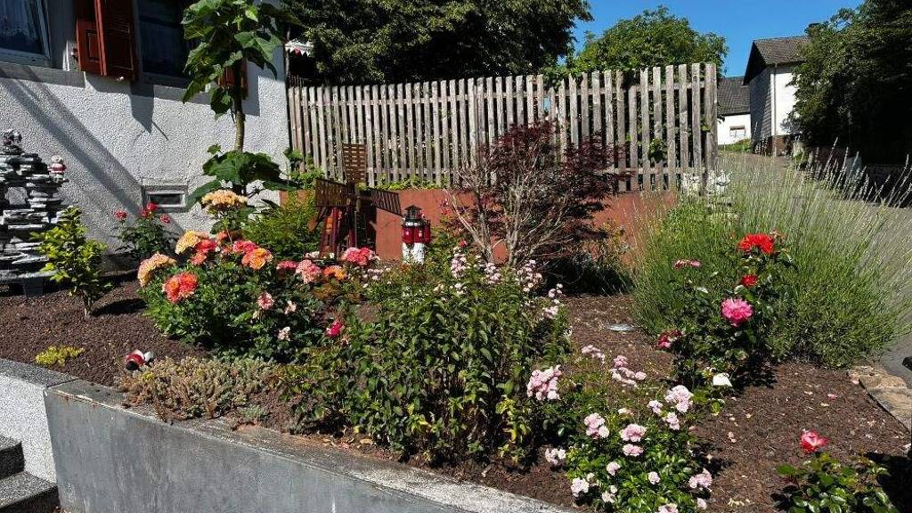 Ein kleiner, pflegeleichter Vorgarten ist aktuell mit schönen Rosensträuchern angelegt. Hier könnte aber auch eine Terrasse entstehen.
