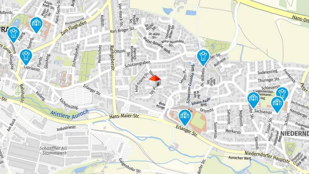 Bevorzugte ruhige Lage in Herzogenaurach- Lohhof. Herzogenaurach mit knapp 24.000 Einwohnern ist bekannt und international geprägt durch die Hauptfirmensitze der Weltunternehmen adidas, Puma und die Schaeffler AG. In Herzogenaurach finden sie alle Schularten, von der Grundschule über Realschule und Gymnasium bis zur Montessori-Schule. Anbindung zum Flughafen Nürnberg über die A3 in 25 Min. Die Autobahnauffahrt Frauenaurach erreichen sie in 5 Min., bis Erlangen Zentrum fahren sie ca. 10 Min. Es gibt auch eine gute Busverbindung zwischen Herzogenaurach und Erlangen.