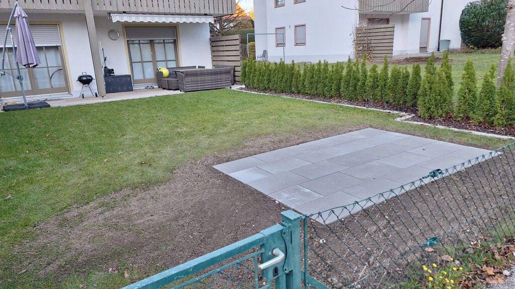 Vom Wohnzimmer aus gelangen Sie direkt auf die ca. 14 qm große Terrasse und in Ihren eigenen, ca. 80 qm großen, Garten. Der Garten wurde 2025 neu hergerichtet mit Rasenansaat und Heckenbepflanzung. Ein neu errichtetes Fundament für ein Gartenhaus ist bereits vorhanden.