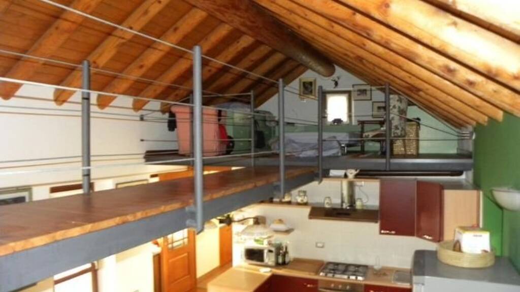 upper floor and underrof - spacey living room with build in kitchen, balcony, open space to the galery with its bridge crossing the house end ending in the bedroom, seperate bathroom
