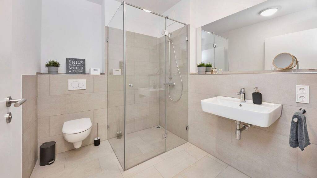 Die Wohnung ist mit einer stilvollen Einbauküche (inkl. Einbaugeräte) ausgestattet und liegt offen zum Wohnbereich. Vom Wohnbereich gelangen Sie auf die Terrasse, die zu entspannten Stunden einlädt. Das Badezimmer ist mit modernen Fliesen ausgestattet und verfügt über eine Dusche. Die Wohnräume sind mit einem Vinyl-Boden verlegt. Für eine angenehme Wärme sorgt die Fußbodenheizung, die in der gesamten Wohnung vorhanden ist. Als Abstellfläche steht Ihnen ein Abstellraum in der Wohnung sowie ein Kellerraum zur Verfügung. Zur Wohnung gehört ein Tiefgaragenstellplatz, der mit angemietet werden muss.