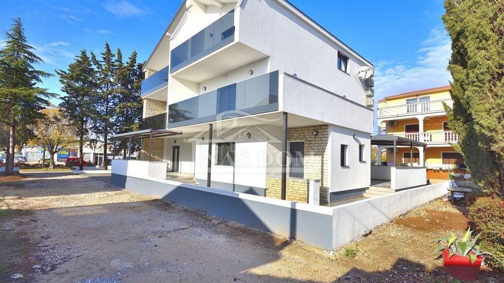 Vodice - Zum Verkauf steht eine komfortable und luxuriös neu renovierte, komplett möblierte Wohnung im Erdgeschoss eines kleinen Wohngebäudes mit insgesamt fünf Wohneinheiten. Die Wohnung erstreckt sich über die gesamte Etage im Erdgeschoss des Gebäudes und hat eine Gesamtwohnfläche von 142,41 m². Sie besteht aus: Flur, zwei Badezimmern, WC, Abstellraum, Küche ausgestattet mit maßgefertigten Elementen und Küchengeräten der Marke Bosch, Esszimmer, vier Schlafzimmern mit zugehörigen großen überdachten Terrassen, Wohnzimmer mit Zugang zu einer überdachten Terrasse von ca. 30 m². Ein weiterer Vorteil dieser Wohnung ist, dass sie zwei separate Eingänge hat und die Raumaufteilung so gestaltet ist, dass die Wohnung derzeit als zwei separate Apartments genutzt wird, ein größeres und ein Studio-Apartment mit zugehöriger Terrasse, Vorraum und Bad. Zur Wohnung gehören zwei Parkplätze mit der Möglichkeit, ein drittes Fahrzeug auf dem Grundstück unterzubringen, sowie ein Hof mit ca. 75 m² Fläche.