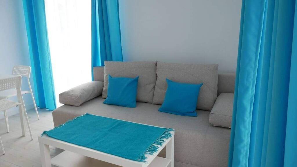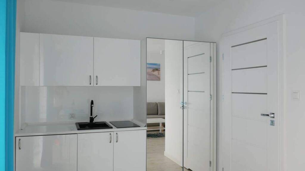 Im Wohnbereich befinden sich eine Schlafcouch, ein Couchtisch, ein Esstisch mit vier Stühlen sowie ein Smart-TV. Das Schlafzimmer ist mit einem Doppelbett und einem großen Kleiderschrank mit Spiegelfront ausgestattet. Die Küchenzeile umfasst Einbaumöbel, ein Zweiplattenkochfeld und einen Kühlschrank. Alle Apartments verfügen über elektrische Fußbodenheizung sowie Warmwasseraufbereitung über ein Ariston-System, das sich bequem per WLAN steuern lässt.
