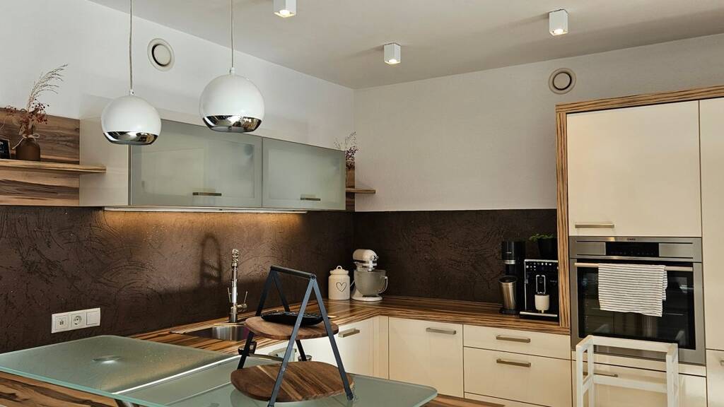 Die moderne Küche ist stilvoll in das Raumkonzept integriert, geschmackvoll beleuchtet und gehört zur Wohnung.